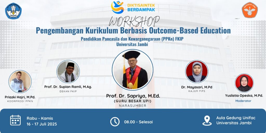 Jambi – Program Studi Pendidikan Pancasila dan Kewarganegaraan (PPKn) Fakultas Keguruan dan Ilmu Pendidikan (FKIP) Universitas Jambi (UNJA) telah sukses menyelenggarakan Workshop Strategi Pencapaian Capaian Pembelajaran Lulusan (CPL) Program Studi Berbasis Outcome-Based Education (OBE). Kegiatan penting ini dilaksanakan pada hari Read More …