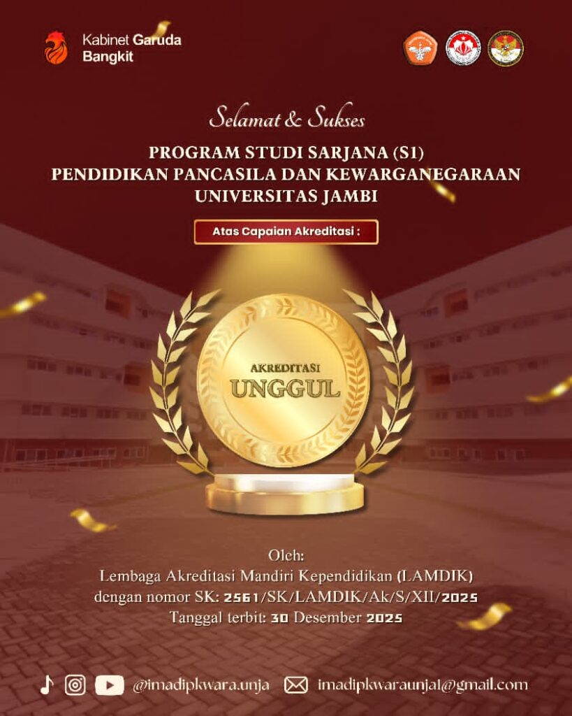 JAMBI – Kabar membanggakan datang dari Program Studi Pendidikan Pancasila dan Kewarganegaraan (PPKn) FKIP Universitas Jambi. Berdasarkan hasil keputusan Lembaga Akreditasi Mandiri Kependidikan (LAMDIK), Prodi PPKn resmi ditetapkan meraih peringkat Akreditasi UNGUL. Status akreditasi tertinggi ini tertuang dalam Surat Keputusan Read More …